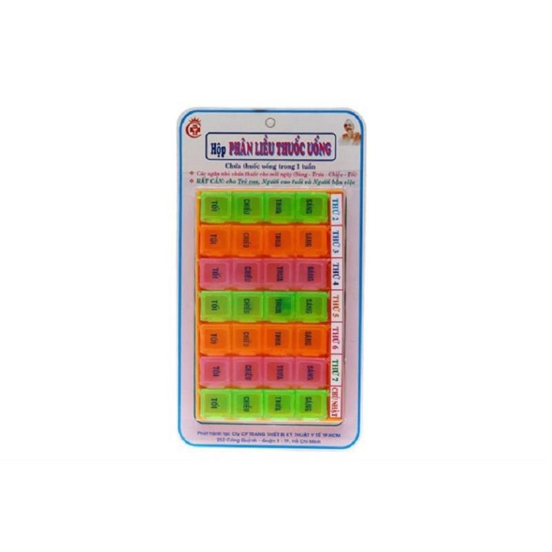 - Người cao tuổi hoặc người quá bận, rất dễ quên, có khi uống thuốc rồi mà cứ tưởng chưa, có lúc uống lộn thuốc sáng thành tối. Hậu quả là không hết bệnh. Do đó dụng cụ phân liều thuốc 1 tuần này giúp ta uống thuốc đúng liều, đúng ngày, đúng buổi theo sự chỉ định của Bác sĩ.